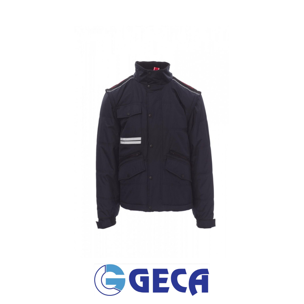 Giubbino da uomo, maniche staccabili, zip 8mm in plastica con cursore in metallo con patta e bottoni in plastica, retro sagomato e con cappuccio richiudibile nel colletto, due tasche esterne LOCK SYSTEM e due con zip, inclinazione delle tasche per agevolare l’ingresso della mano, una tasca al petto porta smart phone e anello porta badge, bande riflettenti sulla tasca e schiena. Interno: imbottito, pile in contrasto su schiena e collo , una tasca, zip interna per agevolare stampe e ricami.