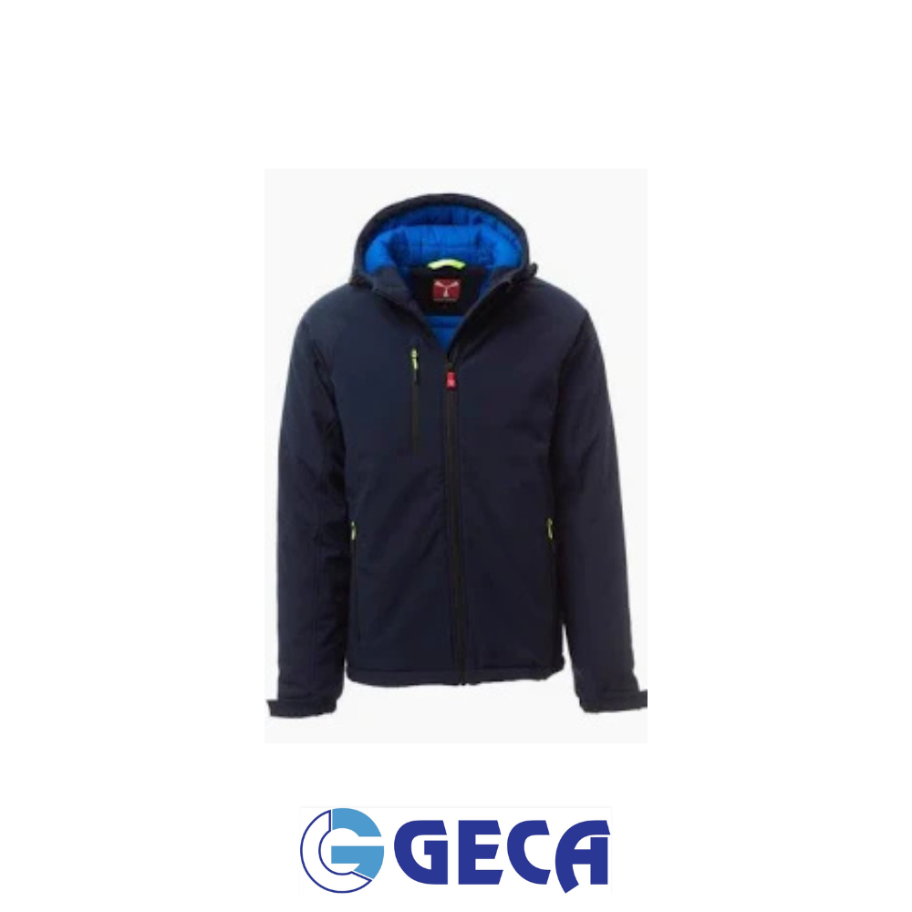 Soft-shell 3 strati, dalla calda imbottitura (160g/m²), da uomo, chiusura tramite zip con cursore in metallo “semi-auto lock” e tiretto personalizzato. Cappuccio fisso con coulisse regolabile. Polsini elasticizzati, regolabili con strappo. Due tasche laterali e una tasca al petto, chiuse con zip. Tiretti fluorescenti. Due tasche interne, una sagomata con zip e una porta tablet con chiusura a strappo. Fondo regolabile con stopper personalizzati.