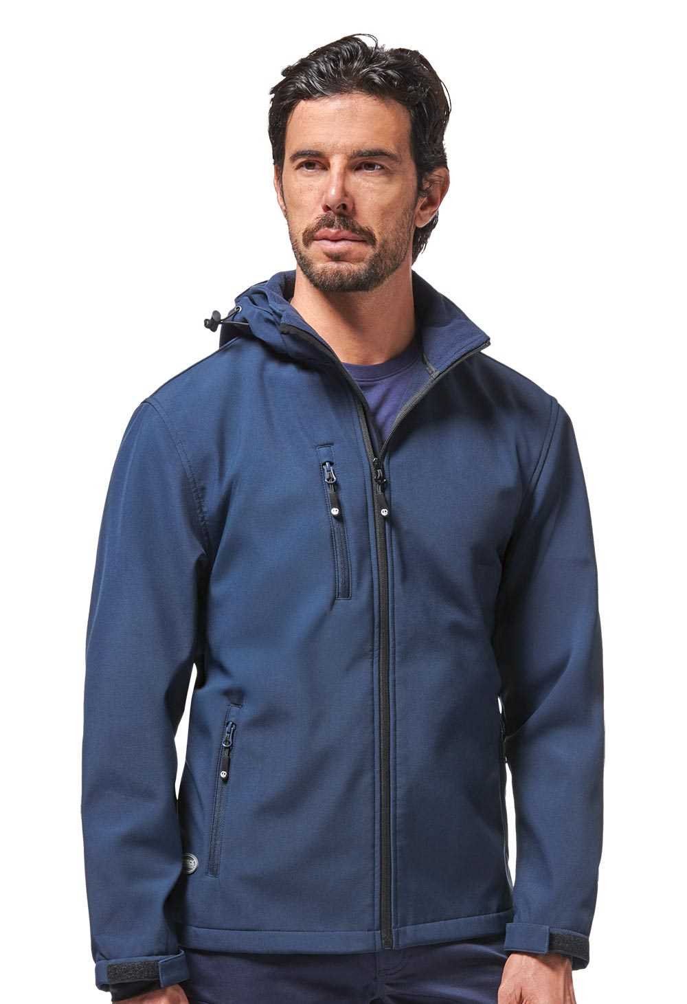 DESCRIZIONE: Giacca in Soft-Shell impermeabile, traspirante e antivento. Fodera interna in morbido micro-fleece. Chiusura centrale con zip impermeabile. Cappuccio staccabile. Polsini regolabili con velcro e polsino antivento elasticizzato con foro passa-pollice. Dotato di due tasche frontali e una sul petto chiuse con zip, due ampie tasche interne.