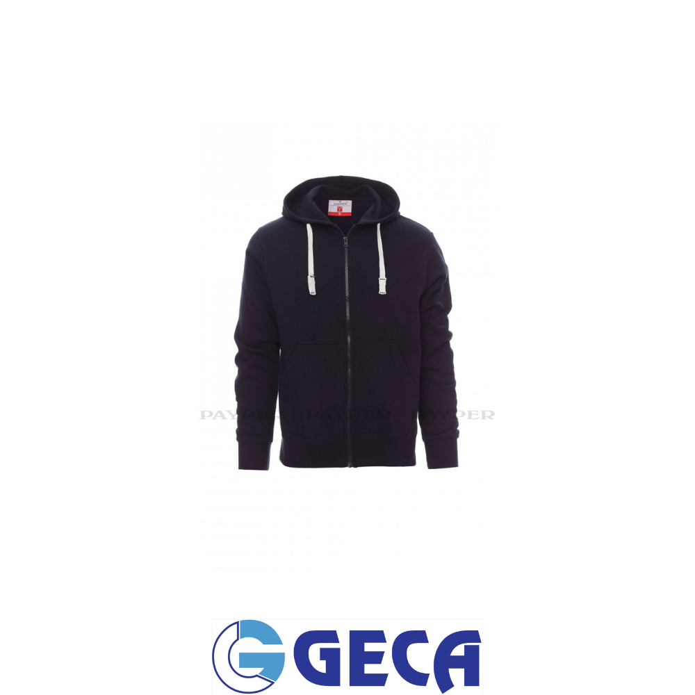 Felpa da uomo, zip intera in plastica a cursore singolo in metallo, cappuccio, coulisse in corda con cuciture in tinta con la felpa, manica a giro, tasche a marsupio, polsini e vita in costina elasticizzata. Cuciture rinforzate, nastro di rinforzo interno collo in tinta.