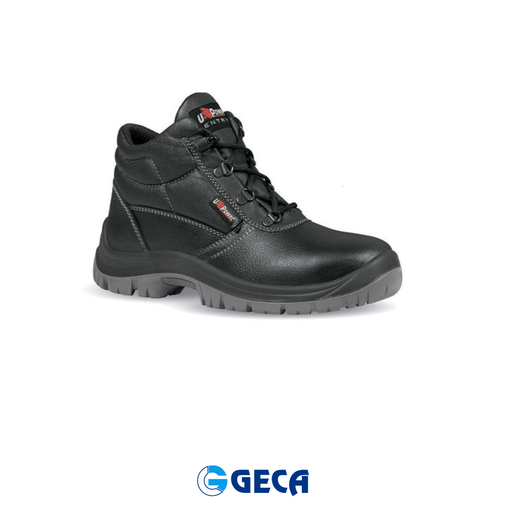 Scarpe antinfortunistiche alte sicure della linea Entry U Power, con tomaia in pelle stampata, idrorepellente, puntale in acciaio, antiperforazione, antiscivolo, lamina in acciaio ergonomica e suola PU/PU.